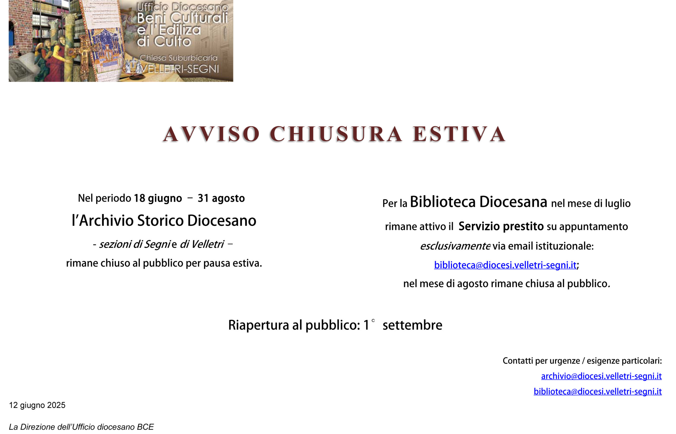 archivio@diocesi.velletri-segni.it biblioteca@diocesi.velletri-segni.it