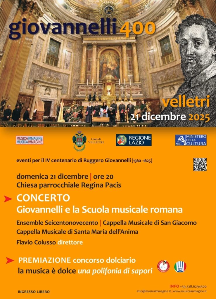 A cura del Comune di Velletri e Musicaimmagine ETS con il sostegno della Regione Lazio e del Ministero della Cultura, insieme all’Ensemble Seicentonovecento, la Cappella Musicale di San Giacomo e la Cappella Musicale di Santa Maria dell’Anima